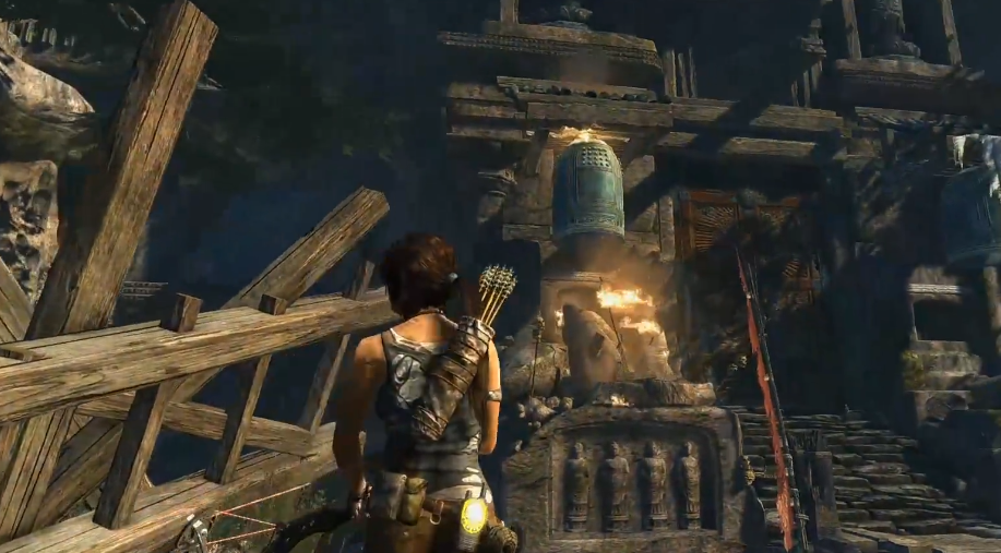 第二个关键部分是一个左右两侧有风的中央悬挂大钟的场景。玩家需要先开启一侧窗户,根据风向用弓箭拉动大钟撞击左右两边的木柱,待两侧木柱都被撞断后,将两个窗户全部打开,再次拉动大钟撞击中间结构使其坠落,大钟会砸穿地面形成通路。这一环节需要精准把握风向和拉钟时机,建议先观察风向规律再行动。