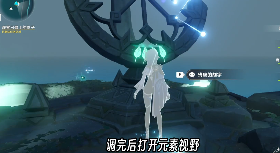 上岛后往祭坛右边走会发现一个石头堆,打碎后能捡到一张残破的笔记。这时候打开背包阅读笔记,会发现提示要在凌晨2点到5点之间调查日晷。把游戏时间调到这个时段,然后开启元素视野,就能看到祭坛周围飘着四片发光的叶子,这就是需要处理的风元素聚集点。