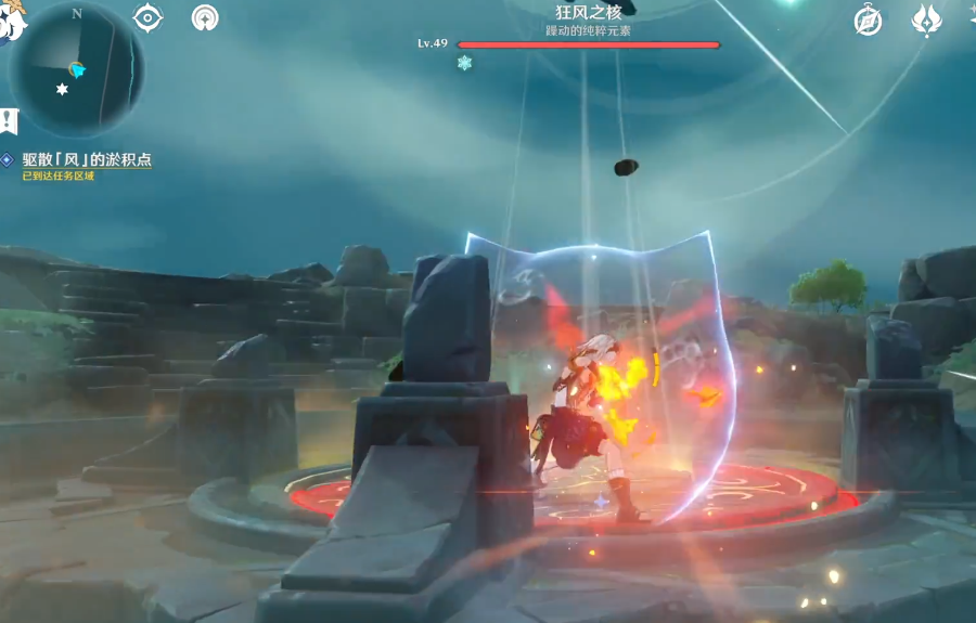 顺着元素视野的指引,咱们要依次清除四个风球。第一个在祭坛后方靠近风神瞳的位置,第二个在右侧柱子上,第三个在海滩边,第四个在西北角的海水里。处理水里的那个记得用冰系角色冻住水面再打。全部清除后回到祭坛中央,用风元素攻击出现的大型风球,就会召唤出36级的狂风之核BOSS。