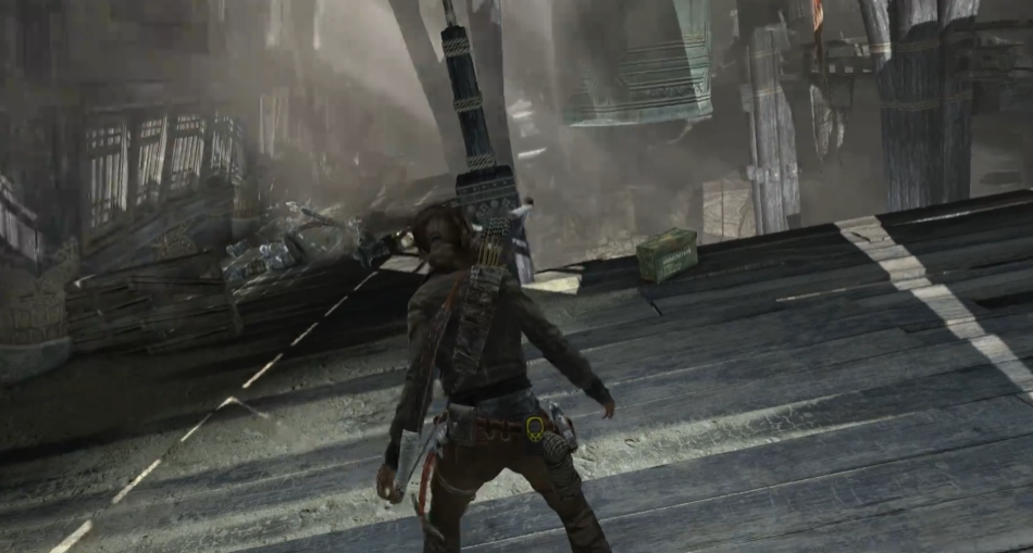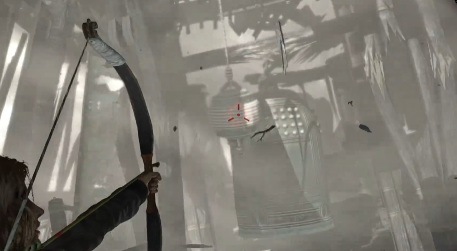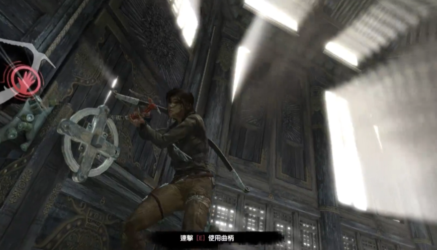 左右两侧各有一扇带机关的窗户,靠近后会提示互动按键。先转动任意一侧的机关打开窗户,这时强风吹入会让悬挂的摆锤晃动。如果摆锤幅度不够,可以用弓箭射出绳索箭拉住摆锤,手动将其拽到风口位置增加冲击力。等摆锤撞断同侧的木质支柱后,记得关闭这扇窗。