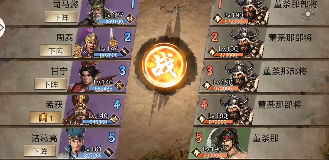 司马懿当副将可以反弹敌人战法,这是通关的核心技巧。貂蝉勾引成功后,司马懿反弹第二个敌人的战法,这样能大幅削减对方兵力。夏侯惇放最后,面对被反弹战法打残的董荼那,收尾会非常轻松。如果前面武将发挥得好,基本能稳过。