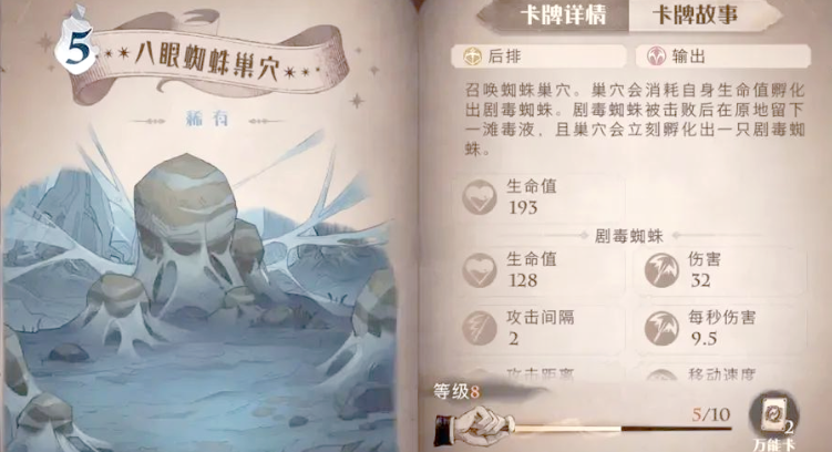 史诗卡牌如三本妖怪书、烈火熊熊,稀有卡如毒液、小精灵、八眼蜘蛛巢穴等易获取且实用性高。贝拉回响搭配气象咒、统统加护等控场卡牌能有效提升决斗胜率。伙伴卡选择弗雷兄弟或卡珊德拉,兼顾输出与防守。战斗中需注重走位与技能释放时机,通过飓风咒、充气咒等控制技能打断对手节奏,利用召唤物消耗对方解场资源。