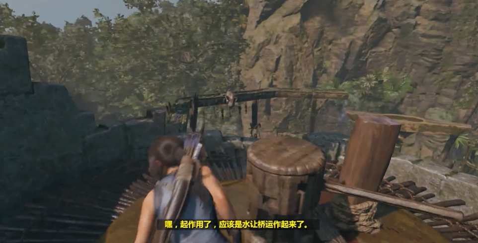 快速跑到桥下,用绳索箭矢连接降下来的绳桩和对岸断桥上的绳桩。如果动作太慢,绿色容器里的水会漏光,就得重新推石轮。瞄准时确保两边的绳圈对齐,射箭后绳索会自动绷紧,桥面会被拉起来形成通路。这里建议提前调整好视角,避免瞄准耽误时间。