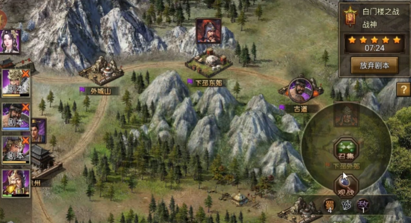 白门楼单挑完毕后可以突进两个武将来拦截曹操军,一个留在白门楼等结束剧本,另一个去处理事件点。处理完事件后等打下白门楼就马上结束剧本。要注意的是困难模式下曹操军会进去5个NPC,所以一定要赶在下一批曹操军到达前进入白门楼并刷影子。单挑完小沛后记得去打丰县,等小沛打下就去处理事件再到丰县集合。