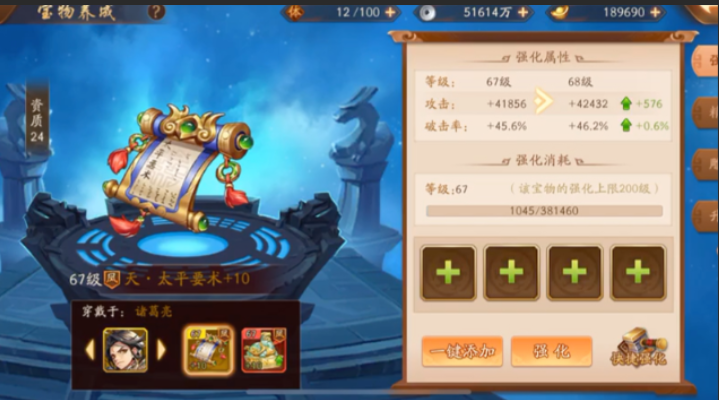 装备选择上优先考虑激活缘分加成的贪狼长枪或太平要术,前者提供稳定的攻击增幅,后者则增强技能连贯性。兵符推荐搭配增加暴击率的霸王横江或提升连击伤害的双星贯日,这些配置能最大限度发挥张辽的爆发特性。对于追求极致输出的玩家,可侧重强化其暴击与命中属性,而偏重生存的玩家则建议平衡伤害与减伤比例,确保其在战场上的持续作战能力。
