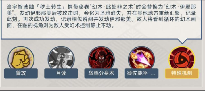 秽土鼬携带伊邪那美的核心机制是通过装备专属秘卷幻术·此处非之术实现形态转换。该秘卷会将常规防反技能替换为伊邪那美,触发后进入特殊防反状态,具备记录敌人攻击类型的功能。攻击类型分为普攻、一技能、二技能、秘卷、通灵和奥义六类,系统会自动归类记录,例如1A和3A均视为普攻类型。记录完成后再次防反相同攻击类型时,将直接发动伊邪那美使敌人陷入幻术控制状态。