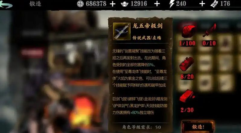 获取龙五帝极剑的首要条件是完成主线剧情并达到57级,解锁修罗塔挑战。通过击败修罗塔30层首领可获得武器蓝图,这是锻造的基础材料。该副本对装备有一定要求,建议携带银月幻体心法争取先手优势。同时需完成战令任务获取黑钢与断罪残刃材料,这两项是锻造必需资源,战令9级和17级奖励可优先选择对应物品。