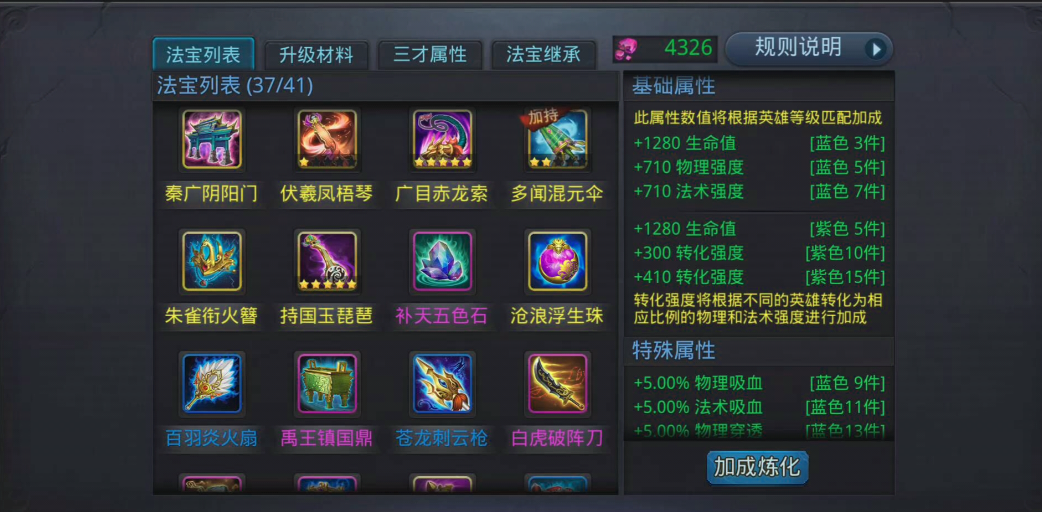 法宝收集策略上应优先凑齐15件紫色法宝激活转化强度加成,该属性会结合英雄类型自动适配物理或法术强度。新增的暴击伤害加成与减免属性需收集21件蓝色法宝解锁,虽非赤精子核心需求但能提升整体战力。须弥幻境、修罗血战等玩法是稳定获取法宝碎片的渠道,而帮派兑换和活动奖励则可定向补充特定法宝,避免资源分散导致养成效率低下。