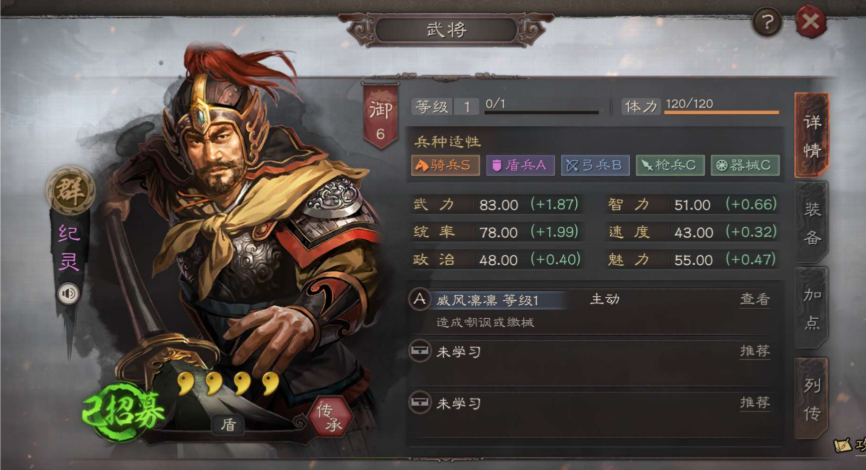 纪灵自身作为四星武将,其价值主要体现在自带战法威风凛凛上,该战法有百分之四十五的基础概率对敌军单体施加嘲讽或缴械状态,满级后还有百分之七十五概率额外释放一次,形成群体控制效果。纪灵的统率成长属性突出,达到一点九九,在四星将中属于较高水平,配合骑兵或盾兵的A级适性,能在战斗中承担肉盾角色,有效保护友军并干扰敌方输出。保留纪灵本体可以组建以控制为核心的过渡阵容,尤其在游戏前期或资源有限时性价比高。