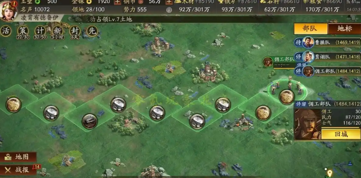 兵马未动,粮草先行,攻城前准备工作特别重要。第一个关键就是铺路。游戏规定,你只能从自己或者盟友已经占领的地块上,向相邻的目标发起进攻。你得一块地一块地占过去,像修路一样,一直连到你想打的城池边上才行。如果城离得远,自己铺路太费地块,可以试着和附近的其他玩家商量,看能不能借个道。铺路的时候还有个巧法子,可以一边往前占新地,一边把后面已经用不上的老路地块放弃掉,只要最后保证有一块你自己的地紧挨着目标城就成。路铺好了,记得提前在靠近城池的地方建好营帐,这玩意儿能让你远道而来的部队快速恢复士气,不然士气掉光了,部队连三成实力都发挥不出来,那可就白跑了。