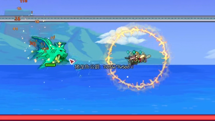 猪鲨公爵的战斗随其生命值下降分为不同阶段。第一阶段初始它会进行五次连续冲撞,之后会交替释放追踪玩家的爆破泡泡和召唤鲨鱼龙卷风。泡泡可以被任何攻击打破,而龙卷风会垂直下落并发射可以穿透平台的鲨鱼龙,需要小心规避。当生命值降至50%以下时进入第二阶段,猪鲨公爵眼睛发光,属性增强,冲撞次数变为三次,释放的泡泡数量更多,龙卷风也会变得更大且具有追踪性。在此阶段,它的防御力会下降,但攻击速度和伤害显著提升,攻击还可能附带流血或野性咬噬等限制生命恢复的减益效果。