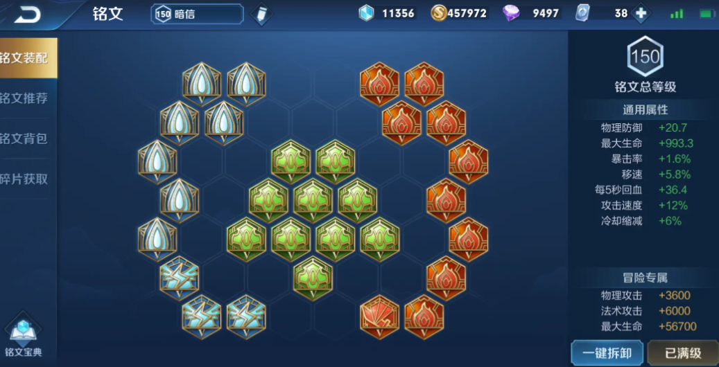 暗信的铭文和出装需要围绕其单带牵制、高机动性和依赖普攻输出的核心玩法来构建,强调攻速、续航与一定的生存能力,以此确保他在边路对拼和快速清线偷野时能占据优势。铭文搭配上,蓝色通常选择夺萃来提供物理吸血,保障前期的续航和对拼能力,绿色固定选择鹰眼增加物理穿透,红色则以红月为主,提供攻速和暴击率,有时会加入一个祸源进一步补充暴击,这套组合让暗信在拥有末世装备后能更好地卡攻速阈值,对拼更为强势,如果追求更极致的攻速或需要一些移速支援,也可以考虑将部分夺萃替换为狩猎。