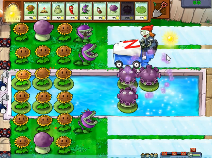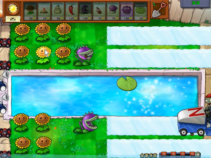 开局阶段的发展策略直接决定了后续防御体系能否顺利建立。游戏开始后,应立刻在后场种植多株向日葵以快速积累阳光资源,这是后续所有操作的基础。在积累阳光的同时,需对最早出现的冰车僵尸保持警惕,此时应果断使用冷却时间短的窝瓜或提前埋设土豆地雷将其消灭,为布局争取宝贵时间。水路区域在前期压力较小,可以适时种植水草进行过渡防御,或为后续布置攻击植物提前铺好荷叶。此阶段切忌在冰道上强行种植植物,所有的布局都应从未被冰封的草地开始,并时刻准备好一次性植物应对突发状况,确保前期阵线稳定。