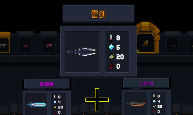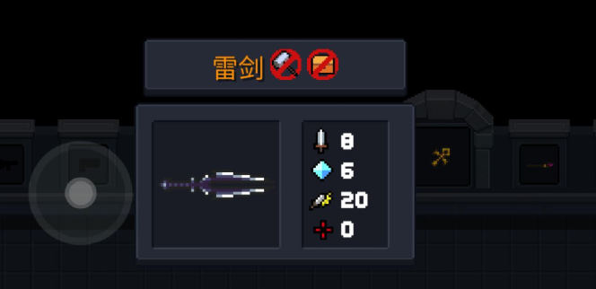 雷剑作为通过火焰剑与冰霜剑合成的橙色近战武器,其核心机制在于蓝量消耗与闪电束的联动效果。当角色剩余蓝量大于等于4点时,每次攻击会消耗4点能量并释放闪电束,造成范围伤害;无蓝状态下仅能进行普通近战攻击且无法连续挥砍。合成雷剑需准备蓝碎片2个、红碎片2个、木头8个及铁矿24个,且必须在地牢中完成合成,大厅锻造台无法直接制作。武器基础属性为攻击力8、暴击率30,兼具高爆发与强控场能力,尤其适合应对密集敌人场景。