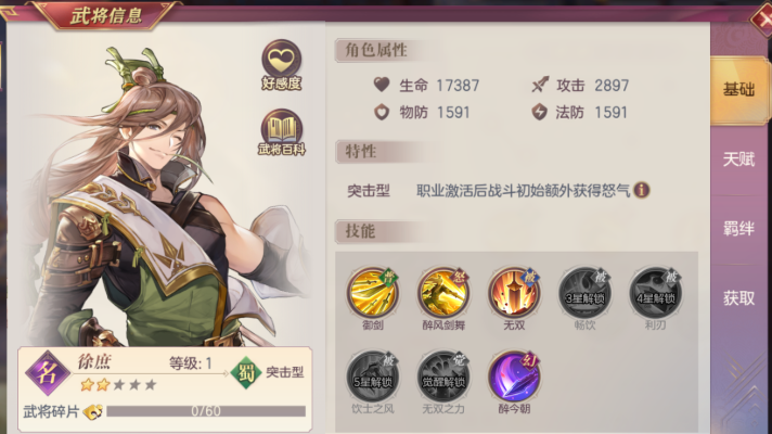 徐庶作为蜀国突击型武将,其核心机制围绕畅饮效果展开,通过叠加层数提升最终伤害并触发无视防御的被动。怒攻技能仙露剑舞可对敌方一列造成154%法术伤害,同时获得2层畅饮,每层提升10%最终伤害,最多叠加4层。五星被动在叠满4层后,所有攻击无视目标35%防御,这一效果在同类武将中属于较高数值。