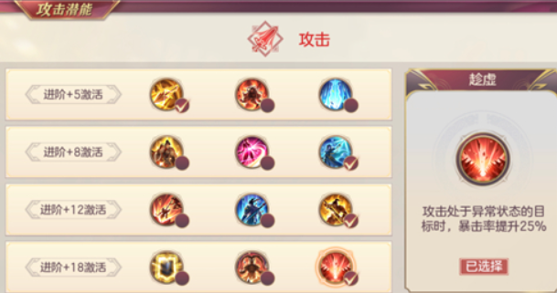 潜能加点推荐战意+摧折+攻袭+刺袭。战意提升对低血量目标的伤害,摧折增加暴击率,攻袭加速怒气回复,刺袭则强化对后排20%的额外伤害。由于徐庶技能可攻击一列目标,刺袭能有效针对敌方后排核心。战魂选择爆裂冲击或战意勃发,前者配合高暴击率提升爆发,后者增强持续输出能力。需注意徐庶生存能力较弱,需通过站位或辅助武将保护以确保其存活至第二次怒攻。