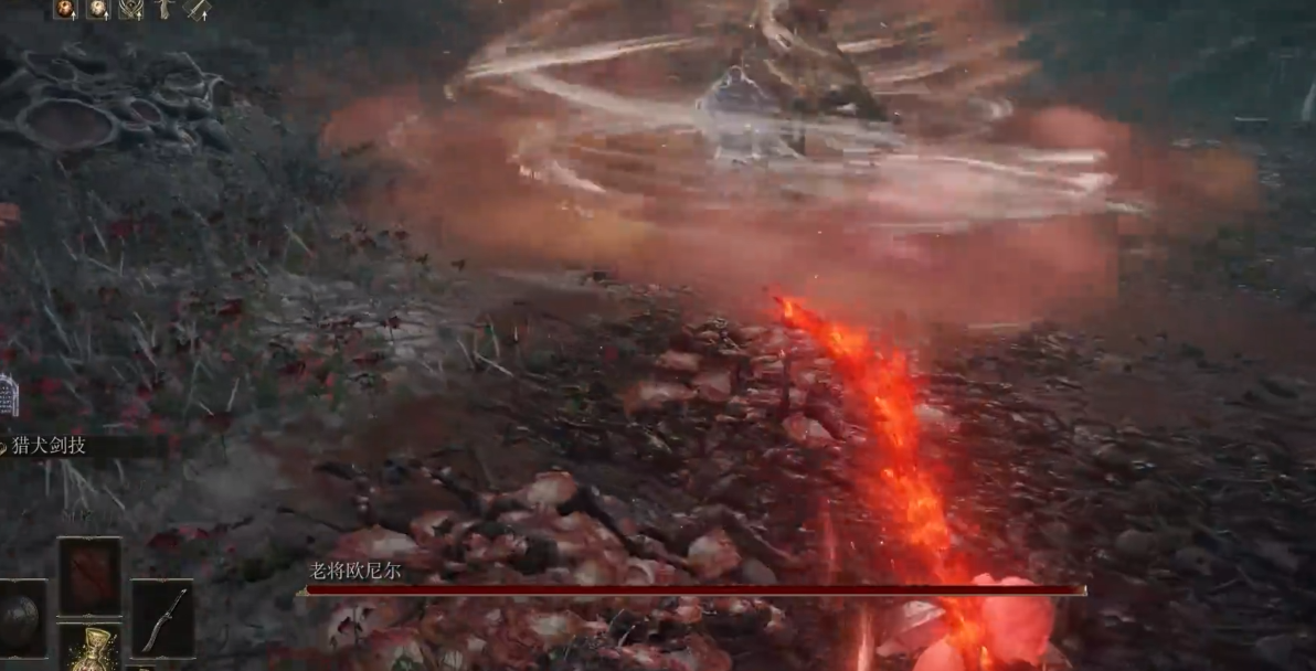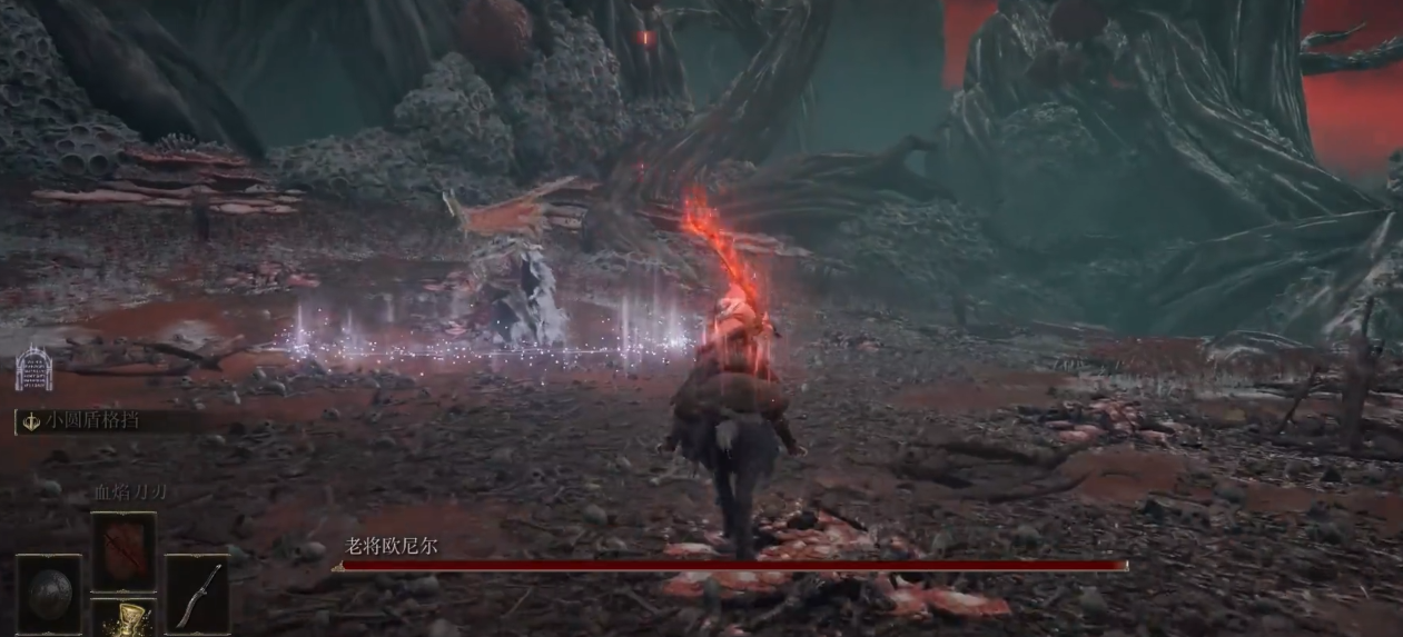 地形利用是击败老将欧尼尔的关键策略。沼泽区域的喷泉会周期性喷发岩浆造成伤害,可将BOSS引至喷泉附近绕圈,使其持续受到环境伤害。需注意喷泉区域同样会积累猩红腐败异常状态,建议携带抗腐败护符或解毒道具。若选择远程战术,可在高处使用弓箭或魔法消耗,但需警惕BOSS突然发动的大范围突进技能。