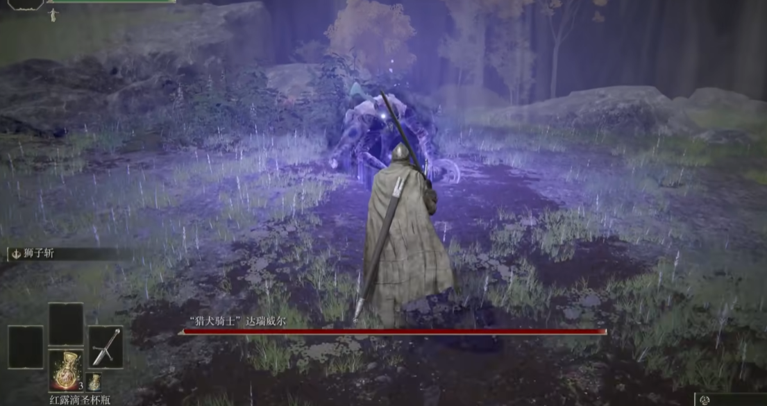 具体路线是从赐福点亚基尔湖南方出发,向南边的山坡前进,即可找到无主猎犬的封印监牢。到达监牢入口后,系统会提示是否进入,选择确认后即可传送至战斗区域。监牢内部空间较为狭窄,需要注意BOSS的快速突进攻击。猎犬骑士达瑞威尔的攻击方式以快速劈砍和突进为主,建议利用监牢中的柱子作为掩体,寻找合适的反击时机。