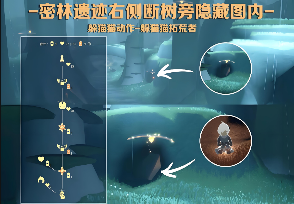 先祖分布较为分散,需要玩家仔细探索。雨林共有八位先祖,分别位于静谧庭院、荧光森林、密林遗迹等区域。第一位先祖位于静谧庭院第一道门后的左侧亭子中,玩家穿过云洞进入雨林后,打开第一扇门即可在左上角亭子找到发抖动作先祖。第二位先祖在荧光森林的第一个亭子左侧,需要玩家飞过云洞并打开第一个门后左拐。第三位先祖位于密林遗迹的桥下,需烧掉黑暗植物进入隐藏洞穴,此处为捉迷藏动作先祖。