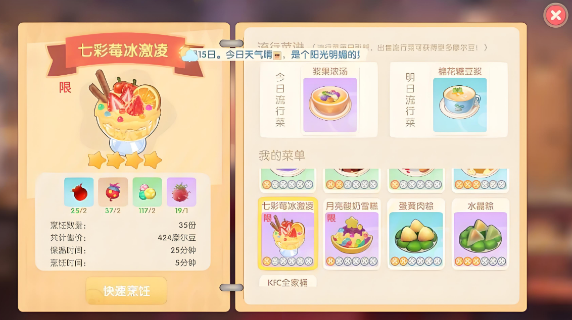 七彩莓冰淇淋的稀有度为四星,保温时间25分钟,烹饪时间5分钟。该菜品在餐厅经营中具有较高收益,推荐作为主卖菜品。玩家可提前批量制作并存放,营业时放置在第四格出售。每5分钟烹制4个灶台可获得140份,利润约583摩尔豆。若每天上线两次并合理规划,单日利润可达7000摩尔豆左右。