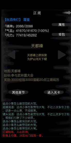 进入天都峰的关键是找到对应关卡并点击进入,咱们先打开游戏主界面,在江湖页面选择天都峰,直接点击就能进入关卡啦。进去之后会触发剧情,跟着剧情走就能顺利开启挑战。前期记得准备好装备和药品,毕竟里面的武林盟弟子可不是吃素的,得认真对待才能过关。