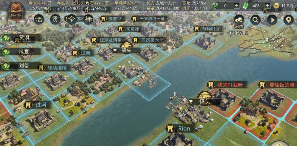 河流是常见的地形障碍,玩家若想跨河扩张势力,需掌握两种核心方法:一是通过码头渡河,二是利用狭窄河段直接通行。码头通常分布于河流两岸,守军等级为5级,需具备一定战力才能攻占;而狭窄河段则无需额外条件,可直接派兵通过。