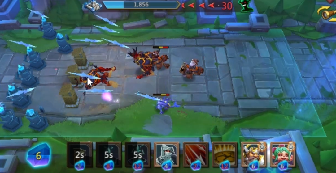 开局在前沿立一座防御塔,后面放炮车,同时用旋风砸对面塔。等敌方英雄出现后,立刻放出图腾咬他们。如果还没拿到高级魔像和炮车,先用小魔像和小炮车过渡。这关清兵压力大,别急着冲,后场先埋魔像和攻击塔,等对方兵线过来再集中火力。