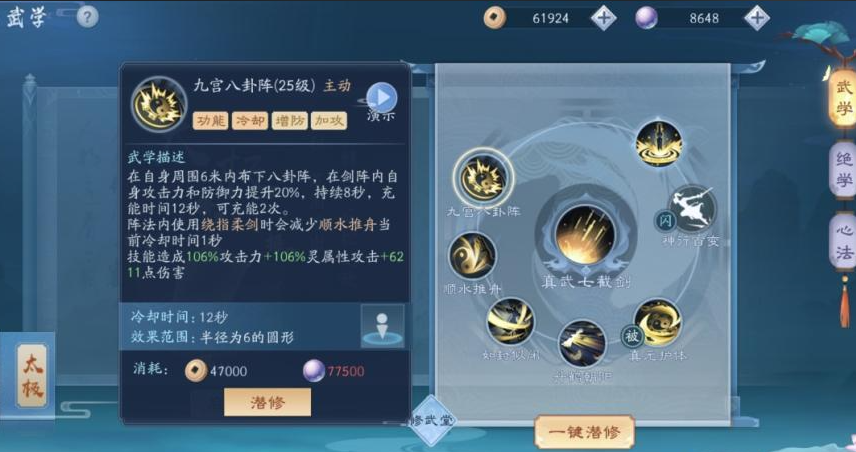 武当的技能体系围绕剑气机制展开,战斗中释放特定技能可积累剑气,最多储存5点。剑气可用于触发绕指柔剑等强力招式,因此在技能循环中需合理规划剑气消耗。核心输出技能如顺水推舟、九宫八卦阵等需优先升级,搭配如封似闭等控制技能形成连招。心法天赋的选择直接影响战斗风格,第一层推荐点满临江逝水提升顺水推舟的持续伤害,太清归位减少冷却时间;第二层优先选择克木为身和羽野长息,提升常驻伤害与减伤效果;第三层针对近战敌人可点罗生九宫降低目标防御。