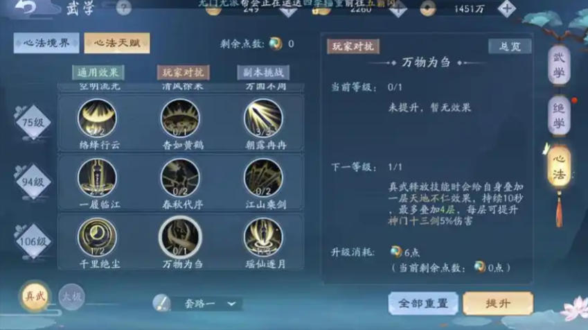 武当作为新笑傲江湖中的核心门派之一,以内功修炼和剑法为主,擅长以柔克刚、以静制动的战斗风格。武当弟子在战斗中通过积攒剑气释放强力技能,兼具远程牵制与爆发输出的能力。心法系统是武当的核心成长路径,分为武学潜修和心法潜修两部分。武学潜修从1级开启,消耗修为和铜钱提升技能效果,修为可通过侠客派遣、四季商会、冥想试炼等途径获取。心法潜修则在65级解锁,需消耗正气丸参悟境界,并通过通犀丸突破瓶颈,天赋点数用于点亮两套可切换的天赋体系,89级前可免费重置加点。