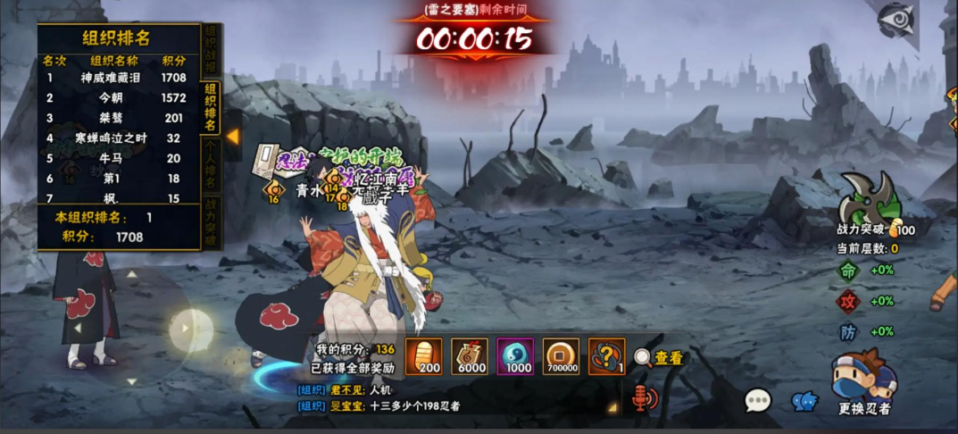 积分获取的核心机制是通过连胜积累和战术配合。战斗胜利后系统会根据当前连胜场次给予对应积分,初始胜利获得3分,后续每多一场连胜额外增加1分,最高可达单场10分以上。需连胜状态下忍者血量不会自动恢复,因此需合理规划出战顺序或使用秘药补充状态。组织成员集中攻打同一要塞能更快提升总积分,分散进攻则可能导致积分被其他组织反超。