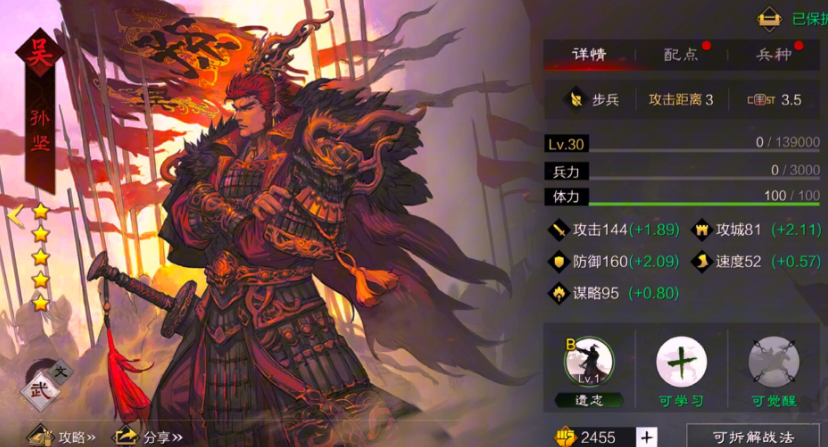 这个武将系统在前期就会送,属于那种拿到手就能很快形成战斗力的类型。他的核心技能遗志是个指挥战法,效果非常独特,在战斗第三回合能给前排的步兵或弓兵恢复一大口兵力,并且之后受到普攻就能反击。这就意味着,你把孙坚放在前锋位置,他就能在前几回合扛住伤害,然后在关键节点回血并开始反弹伤害。他的防御成长不错,攻击也不算低,自带的反击伤害率还挺高,属于能抗能打的典型。前期的开荒队伍和中期的过渡阵容里,他都是一个非常可靠的前排选择,尤其适合搭配一些同样有反击或者追击效果的队友,比如和孙策、孙权组成父子兵就有额外的缘分加成。加点方面主要堆攻击属性就行,战法搭配上可以选步步为营来叠加减伤,或者移花接木来援护队友,思路就是让他站得更久,打出更多反击。