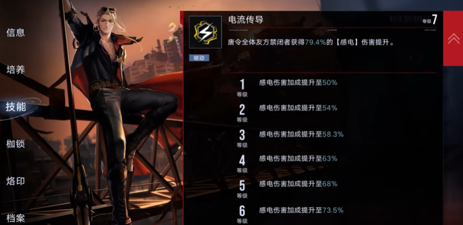 从技能机制上看,唐是一位以物理伤害为主、能够施加感电状态并具备破核能力的角色。他的普通攻击电涌在积攒电能后能进入过载状态提升攻速,必杀技雷霆万钧则能在造成范围伤害与核心伤害的为敌人附加感电标记。他的被动技能电流传导还能提升全队对感电目标的伤害。这些技能组合让他在面对带有核心的敌人时,能发挥出不错的输出与控制效果。